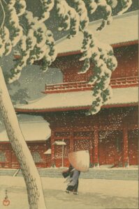 雪景色にお寺を背景にして、着物の女性が傘を差して歩く姿に何となく情緒を感じました。